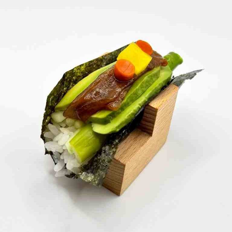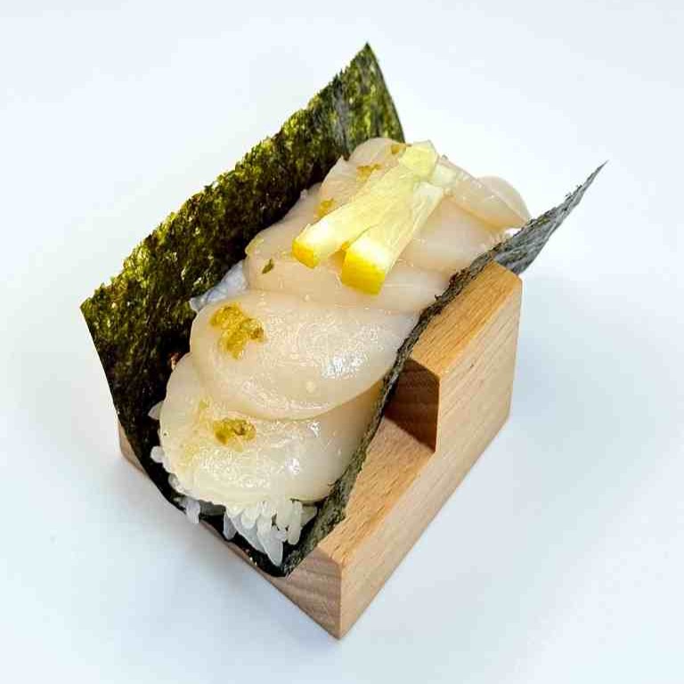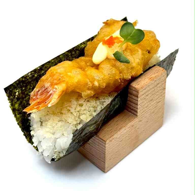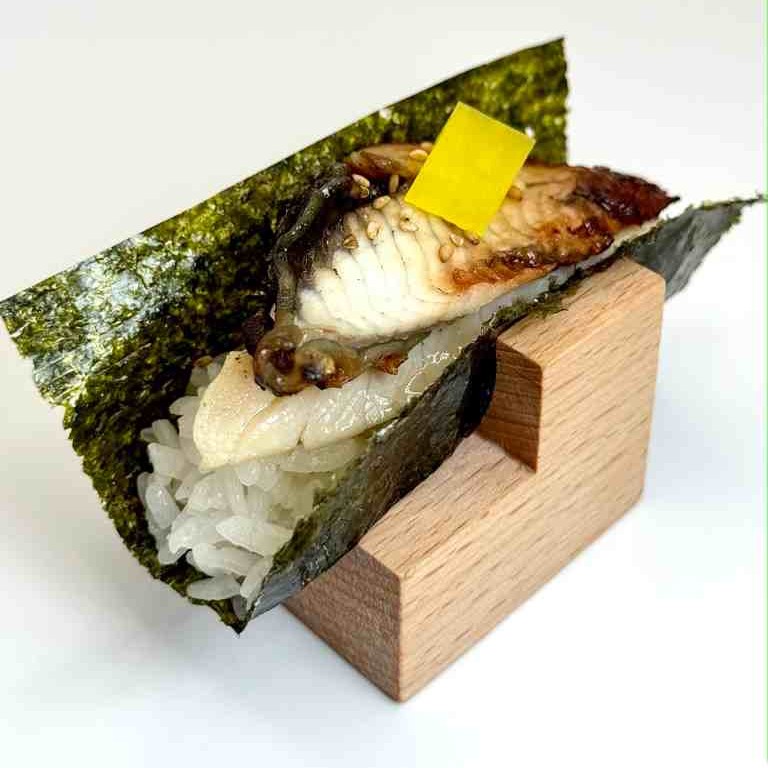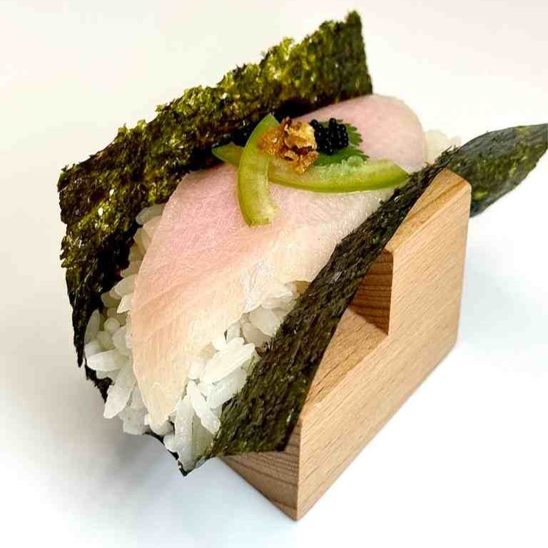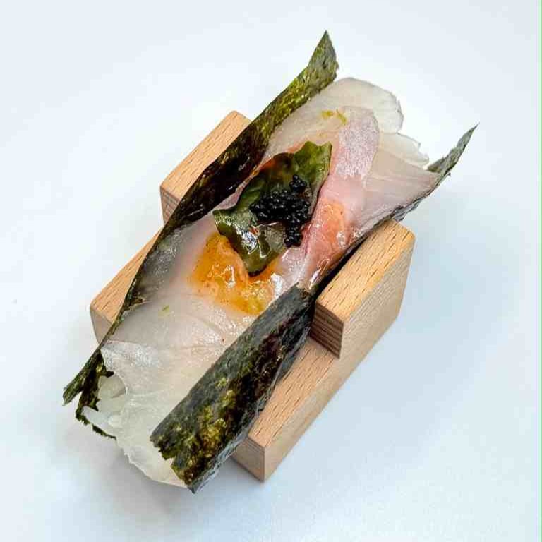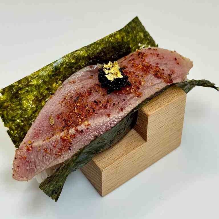 This innovative creation pairs fresh fish with the bold flavor of crispy bacon, blending traditional sushi craftsmanship with a British twist.